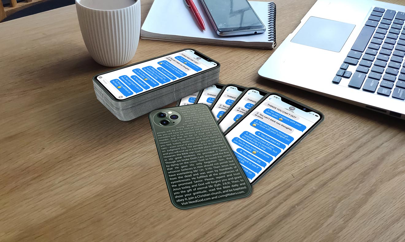 This custom die-cut tract springboards off of a little humor on the front into the gospel on the back.