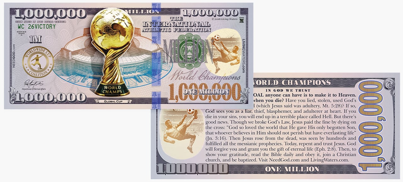 Nearly 50 MILLION Living Waters’ Million Dollar Bill Gospel tracts have been given away by faithful Christians, and they have sparked countless gospel conversations. Now we’ve created a World Cup Edition for this cultural moment.